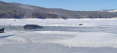 На Красноярском море машина провалилась под лёд, рыбакам удалось спастись