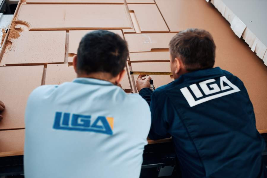 Когда идёшь по нему, в первую очередь обращаешь внимание на полное отсутствие пыли. Как объяснил ведущий инженер компании LIGA Константин Белимов, монтаж оборудования не осуществляется до тех пор, пока к месту его установки не подведены все коммуникации: электроэнергия, если необходимо,- то сжатый воздух от компрессора, а также система аспирации, которая по специальным воздуховодам-трубопроводам уносит из цеха стружку, опилки и прочие отходы работы станков.