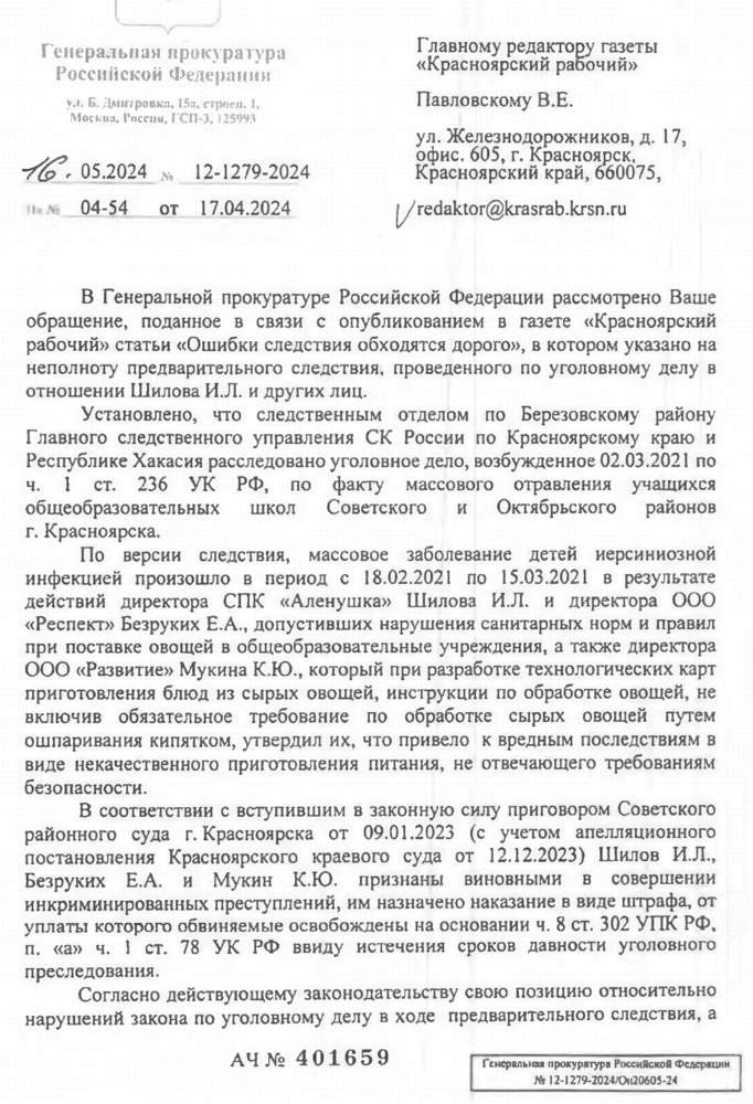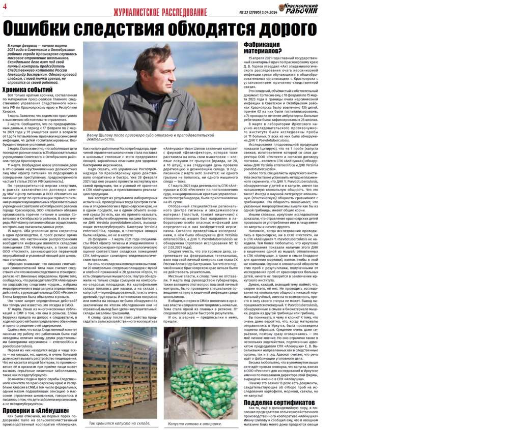 Скандальное дело взял под свой личный контроль председатель Следственного комитета России Александр Бастрыкин. Однако, как было показано в материале Владимира Пантелеева "Ошибки следствия обходятся дорого", опубликованном в "Красноярском рабочем" 3 апреля 2024 года, следствие проведено не просто из рук вон плохо. По мнению автора статьи, уголовное дело было фактически сфабриковано и реально не ответило на вопрос о причинах массового отравления школьников.