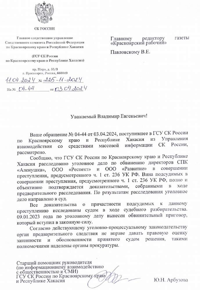 После публикации материала редакция "Красноярского рабочего" направила запрос председателю Следственного комитета РФ А. И. Бастрыкину с просьбой дать соответствующий комментарий. В ответе, поступившем за подписью старшего помощника руководителя (по информационному взаимодействию с общественностью и СМИ) Главного следственного управления СК России по Красноярскому краю и Республике Хакасия Ю. Н. Арбузовой, было отмечено, что вина подсудимых "полно и объективно подтверждается доказательствами, собранными в ходе предварительного расследования". По результатам расследования уголовного дела "вынесен обвинительный приговор, который вступил в законную силу".