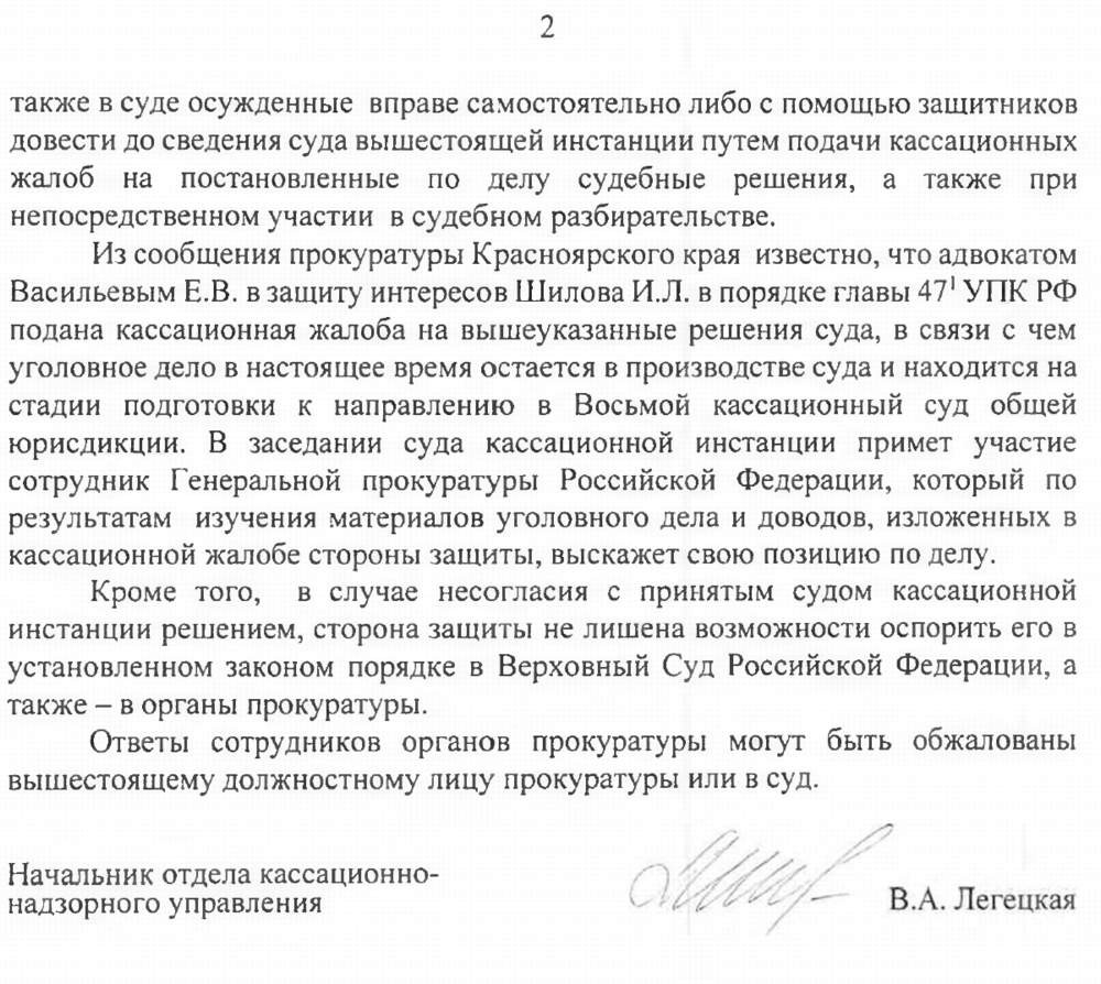 Как явствует из ответа Генпрокуратуры, подписанного начальником отдела кассационно-надзорного управления В. А. Легецкой, адвокат председателя СПК "Алёнушка" Ивана Шилова Е. В. Васильев подал кассационную жалобу на упомянутые судебные решения. В настоящее время дело находится на стадии подготовки к направлению в Восьмой кассационный суд общей юрисдикции, который находится в городе Кемерово.