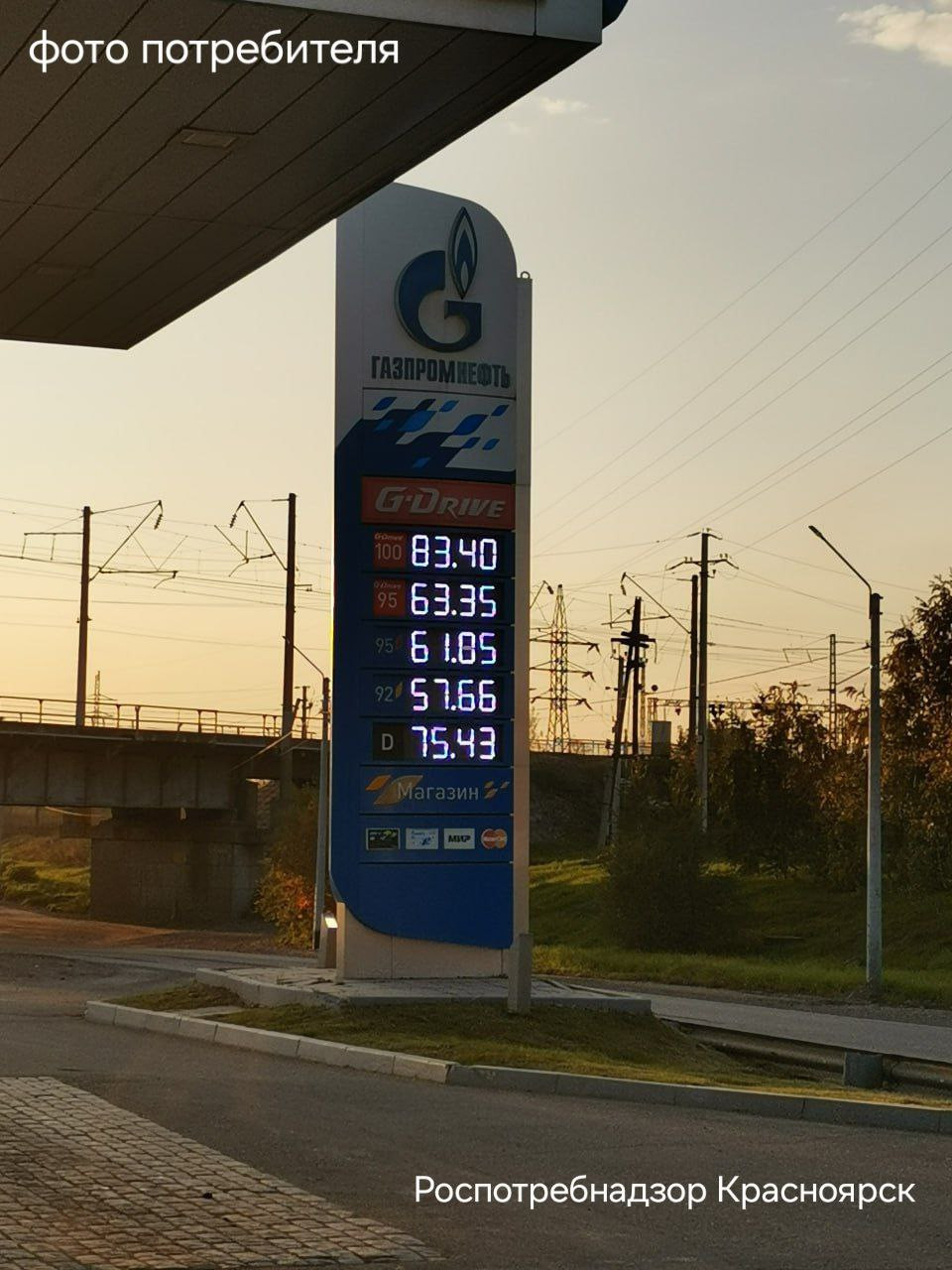 В управление Роспотребнадзора по Красноярскому краю поступила жалоба на АЗС «Газпромнефть», расположенную в посёлке Берёзовка. При въезде на территорию заправочной станции на световом табло была указана цена на бензин марки АИ-95 - 61,05 рубля, однако после расчёта и получения чека выяснилось, что цена составила 61,85 рубля за литр. Водитель попросил персонал пересчитать стоимость покупки, однако ему отказали.