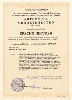 Крупный рогатый скот. В 1978 году после поездки в Америку Аркадию Вепреву удалось обзавестись семенем быков голштино-фризской породы. С той поры и начался процесс облагораживания поголовья коров в хозяйстве. Коровы симментальской мясо-молочной породы, имевшихся в хозяйстве, давали всего по 3000 литров молока в год. Если первые селекции по их скрещиванию с голштино-фризами привели к тому, что они стали давать по 4500 литров, то сегодня их производительность составляет порядка 8000 литров. В итоге на предприятии была выведена своя, красно-пестрая (енисейский тип) порода коров. В 1998 году она была защищена авторским свидетельством. Всякий знает, что голштино-фризы имеют чёрно-белую окраску. Коровы же ЗАО «Назаровское» имеют красно-белую окраску.