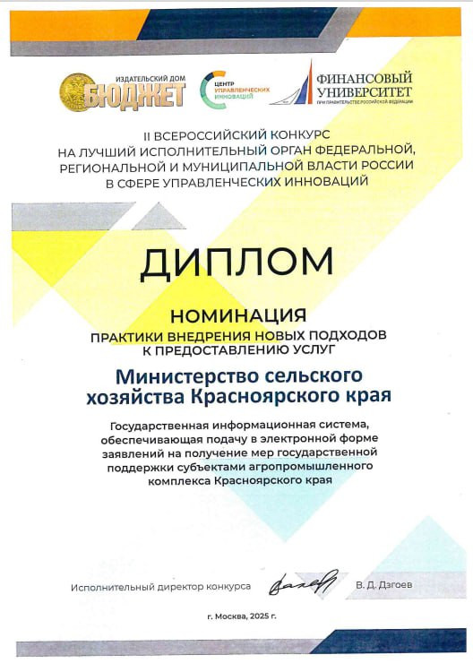 В 2025 году система «Субсидия АПК 24» получила признание на всероссийском уровне. Она стала финалистом III национальной премии «Прорыв года», дипломантом конкурса «Проф - IT» и победителем второго конкурса управленческих инноваций в номинации «Практики внедрения новых подходов к предоставлению государственных услуг».