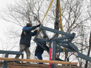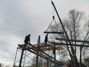 Продолжаются работы по благоустройству Ярыгинской набережной. Сейчас рабочие приступили к монтажу металлических конструкций и укладке деревянного настила для пандуса.