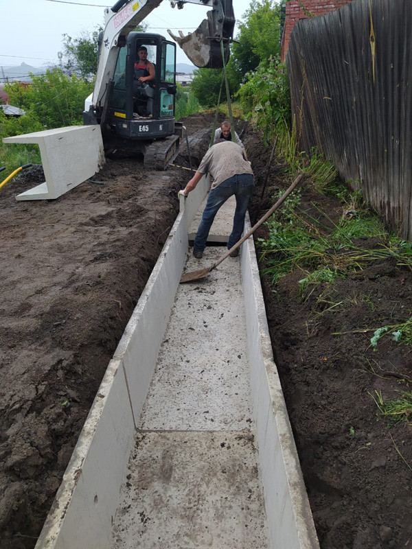 Указанный участок является одним из девяти, где в этом году предстоит восстановить водоотводы. Сейчас подрядная организация укладывает плиты перекрытия лотков на улице Рабочей. После обновления система водоотвода сможет справляться с большими потоками воды.
