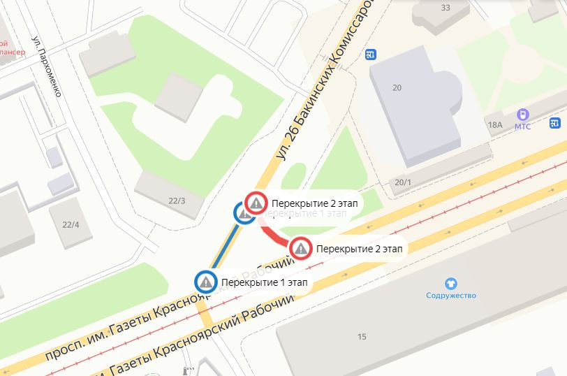 С сегодняшнего дня перекрыт правоповоротный съезд с проспекта имени газеты "Красноярский рабочий" на улицу 26 Бакинских Комиссаров. Это связано с капитальным ремонтом тепловых сетей.