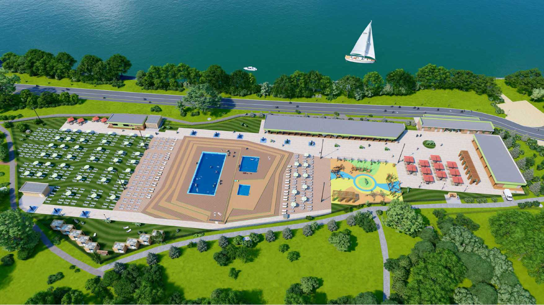 Под пляжно-развлекательный комплекс был выделен участок площадью около 15,5 тысячи квадратных метров. На нём почти отсутствовали зелёные насаждения. Здесь появятся 3 бассейна с подогревом (один из них будет детским), зона для загара, игровая площадка и вспомогательные помещения.