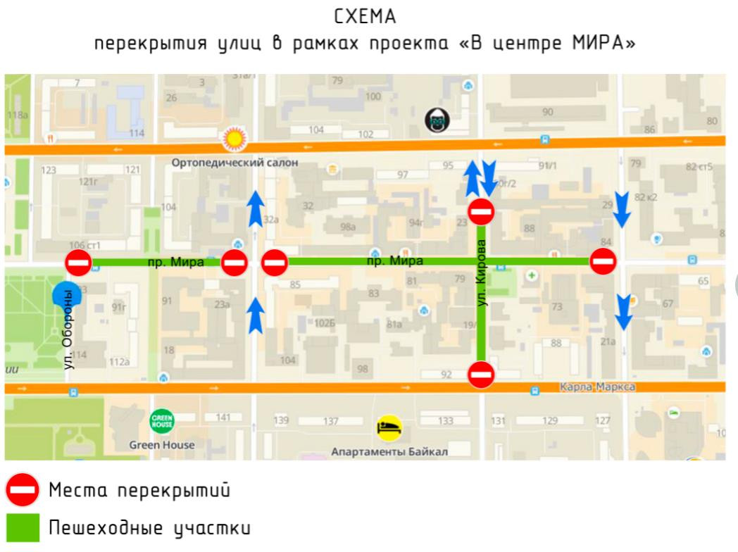 Полностью пешеходными станут участки проспекта Мира от Перенсона до Диктатуры Пролетариата и от Диктатуры Пролетариата до дома №108. Также перекроют улицу Кирова от здания №23 (бывшее кафе Big Yorker) до Карла Маркса.