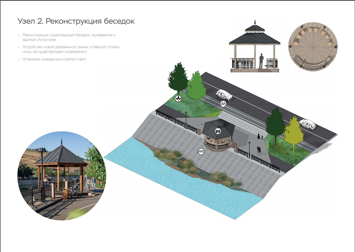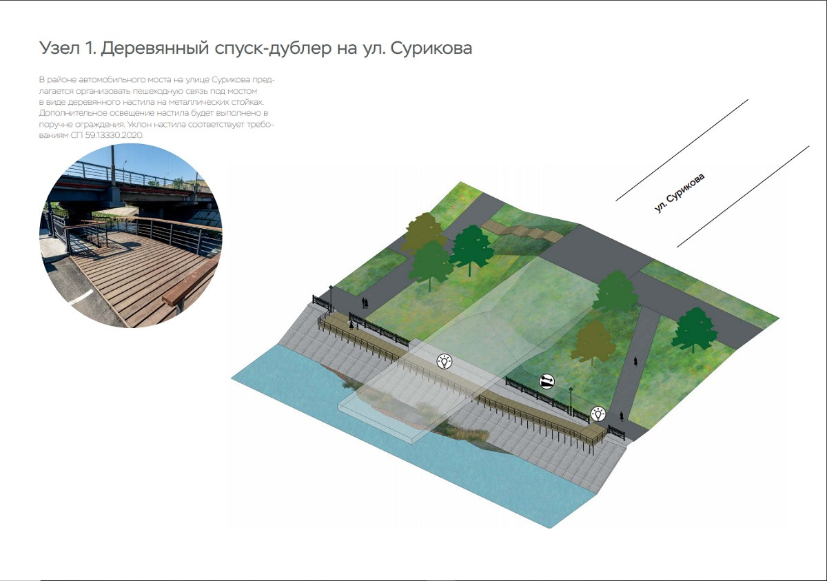 Левый берег Качи архитекторы предложили обновить в единой стилистике со всеми остальными благоустроенными участками вдоль этой реки. Преображение ждёт пространство со стороны детского дома Хазрета Совмена и Дворца пионеров. Там тоже сделают деревянные спуски к воде. Ещё проект предусматривает оформление дорожек, балконы, качели и замену старых кованых беседок.