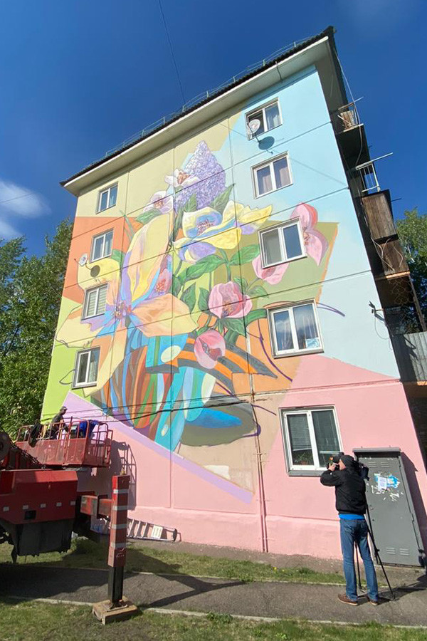 В Красноярске в рамках проекта «АРТ-Десант» молодые художники завершают создание картины на фасаде дома № 15 по улице Западная (напротив мемориала Победы в Кировском районе).