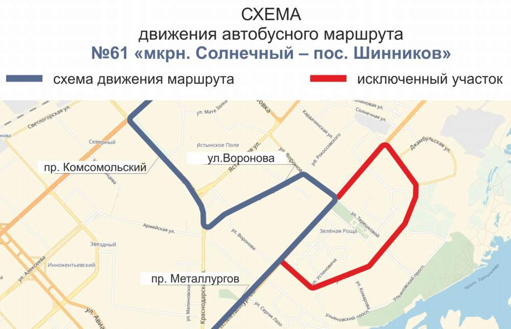 В городе Красноярске автобусы маршрута № 61 с улицы Воронова теперь будут поворачивать сразу на проспект Металлургов, не заезжая на улицу Тельмана. В обратном направлении автобусы также будут двигаться без заезда на Тельмана.