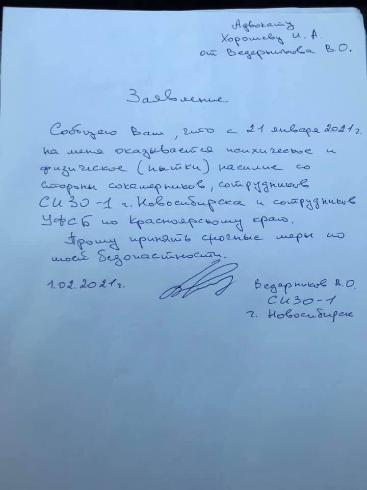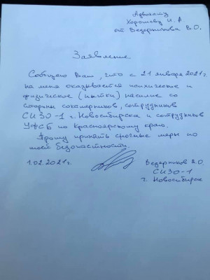 Владимир Ведерников, находящийся в настоящий момент в СИЗО-1 города Новосибирска, рассказал защитнику, что с 21 января его жестоко пытали двое сокамерников. От него требовали дать признательные показания и сотрудничать со следствием.
