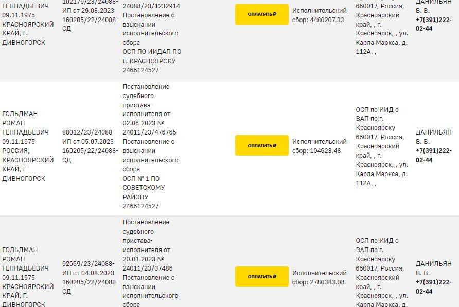 В отношении предпринимателя возбуждено 4 исполнительных производства. Информация об этом есть на сайте судебных приставов. По двум постановлениям взыскание касается алиментных платежей. В первом случае долг составляет 4,48 миллиона рублей, во втором - 2,78 миллиона. Остальные производства связаны со штрафом в размере 300 рублей и 100-тысячной задолженностью.