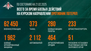 Всего за время боевых действий на Курском направлении противник потерял более 62 450 военнослужащих, 373 танка, 280 боевых машин пехоты, 233 бронетранспортёра, 1 962 боевые бронированные машины, 2 112 автомобилей, 464 артиллерийских орудия, 51 пусковую установку реактивных систем залпового огня, в том числе 13 HIMARS и шесть MLRS производства США, 22 пусковых установки зенитных ракетных комплексов, зенитную самоходную установку, девять транспортно-заряжающих машин, 111 станций РЭБ, 15 РЛС контрбатарейной борьбы, семь РЛС ПВО, 49 единиц инженерной и другой техники, из них 19 инженерных машин разграждения, одну установку разминирования УР-77, пять мостоукладчиков, инженерную разведывательную машину, а также четырнадцать бронированных ремонтно-эвакуационных машин и командно-штабную машину.
