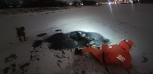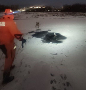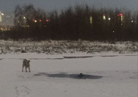 Очевидцы увидели, что собака скулит, бегает и лает около полыньи и позвонили по телефону 112.