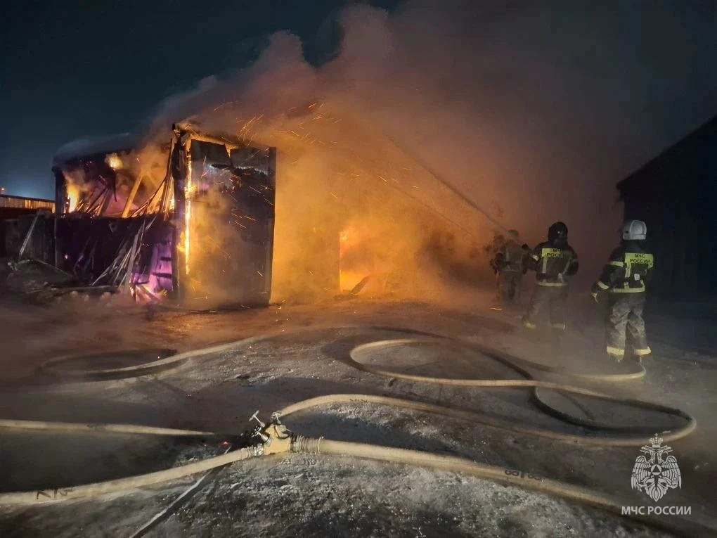 В Дудинке ночью загорелся гараж с тремя транспортными средствами (погрузчик, лодка и легковой автомобиль) на площади 100 квадратных метров. Из-за сильного ветра и большой горючей нагрузки на полную ликвидацию пожара потребовалось более 12 часов. На месте работали 15 человек и 4 единиц техники. Предварительная причина возгорания - короткое замыкание.
