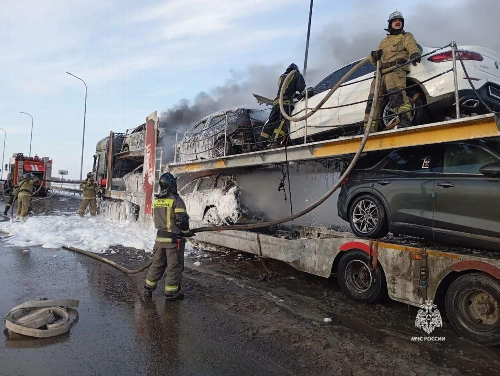 На 12-м километре автодороги Р-255 "Обход города Красноярска" ликвидировано возгорание тягача и 5 легковых автомобилей, находящихся в нём. Пострадали от огня ещё 3 автомобиля. Общая площадь пожара составила 60 квадратных метров. Огонь тушили 3 единицы техники и 12 человек личного состава. Предварительная причина пожара - короткое замыкание электропроводки.