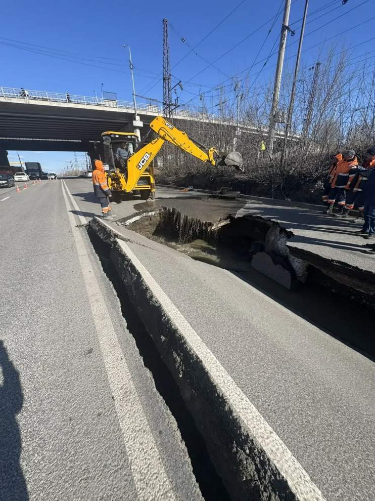 В результате аварии на трубе канализации большого диаметра провалился участок дороги на улице Семафорной. Бригады и техника добираются до места порыва. Срок устранения аварии пока не называют.