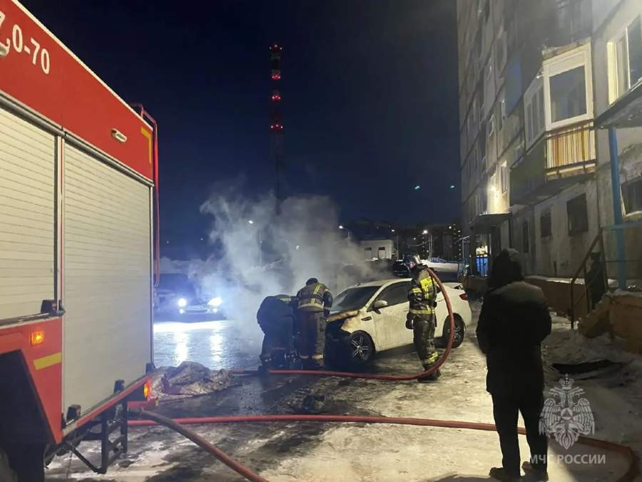 Из-за короткого замыкания электропроводки в Норильске загорелся моторный отсек легкового автомобиля. Огонь на площади 3 квадратных метра тушили 9 человек, 2 единицы техники.