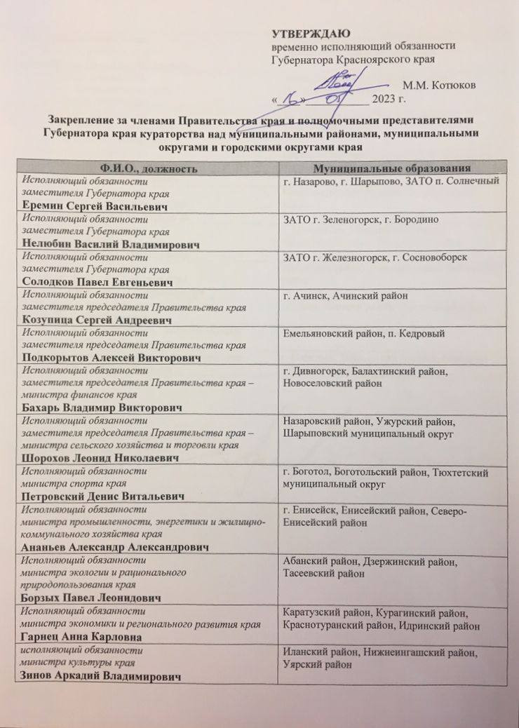 За членами правительства Красноярского края и полномочными представителями губернатора закрепили кураторство над территориями. Районы, округа и города распределил врио главы региона Михаил Котюков.