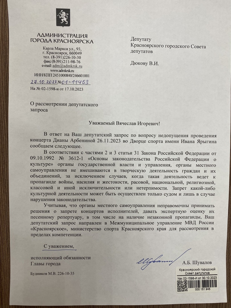 Сегодня депутат горсовета опубликовал ответ главы города. Логинов сообщил, что органы местного самоуправления не вмешиваются в творческую деятельность, если только она не связана с пропагандой чего-то плохого. Решение о запрете выносит суд на основании нарушения законодательства. Запрос был перенаправлен в МУ МВД России "Красноярское" и Министерство спорта края.