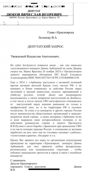 Несколько дней назад Дюков направил запрос мэру Красноярска Владиславу Логинову. Вячеслав Игоревич потребовал не допустить концерта Дианы Арбениной, который должен состояться 26 ноября во Дворце спорта имени Ивана Ярыгина. Депутат указал, что артистка была против присоединения Крыма, отказывалась выступать в Донбассе, критиковала президента и вообще придерживается антироссийской позиции. Чтобы отменить мероприятие, Дюков призвал задействовать любые федеральные, региональные и муниципальные структуры.