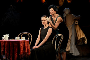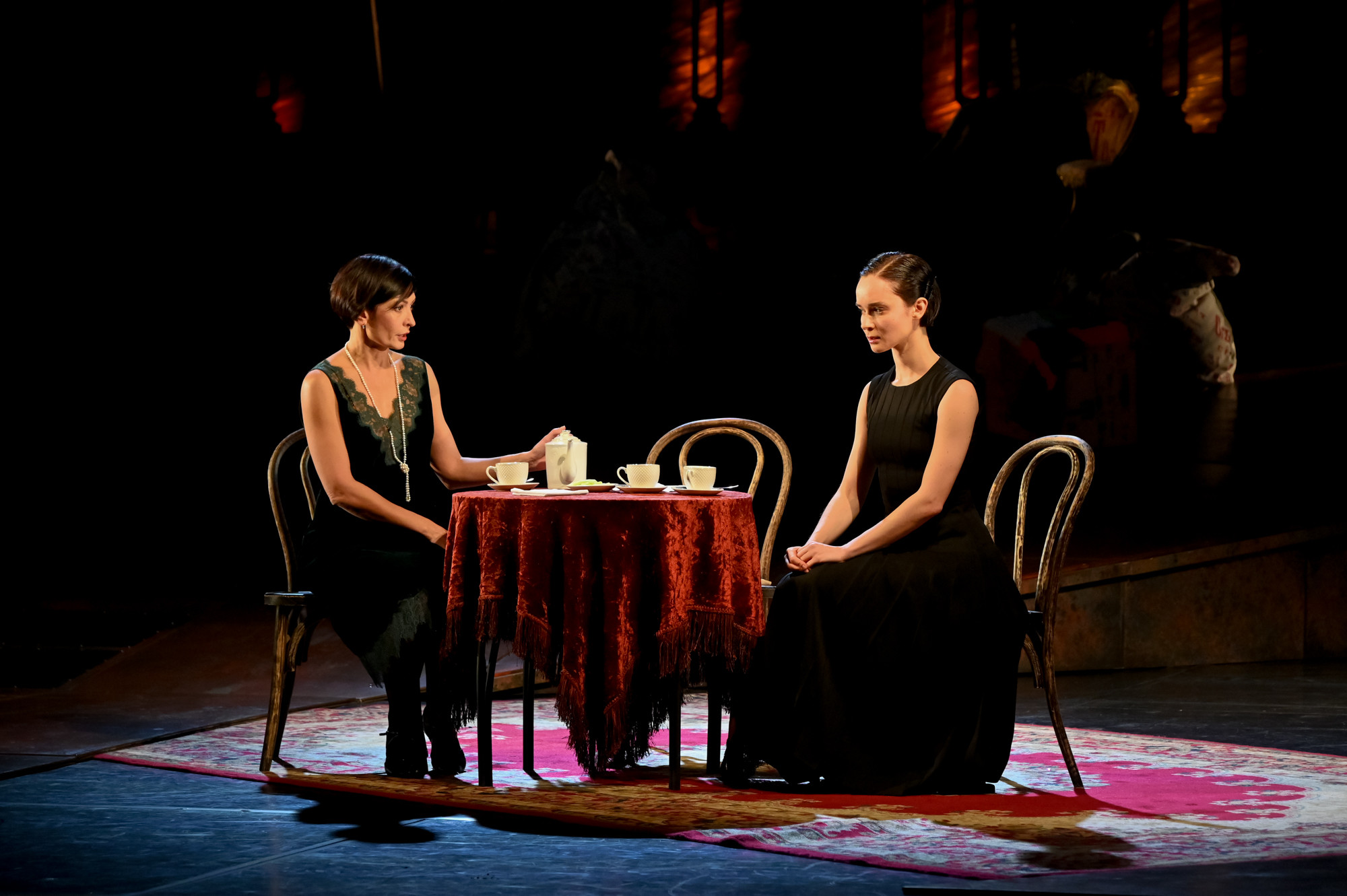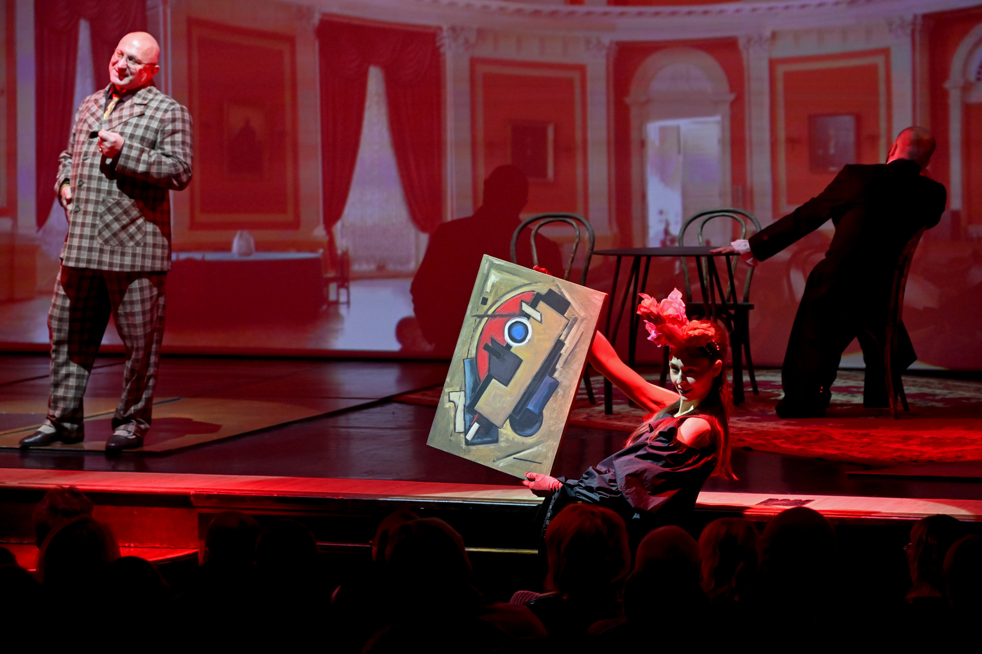 А ещё на излёте Серебряный век, подаривший нам целую плеяду великих писателей и поэтов, где на фоне чётко расчерченного сценографией питерского художника Никиты Сазонова Петербурга с его графикой и вечно мокрой жестью крыш происходит сшибка талантов и бесталанностей, где четвёрка главных героев мучается в поисках себя в то время, когда надвигается на них что-то страшное: об этом постоянно напоминает мрачный музыкальный ряд, написанный композитором Евгенией Терёхиной.