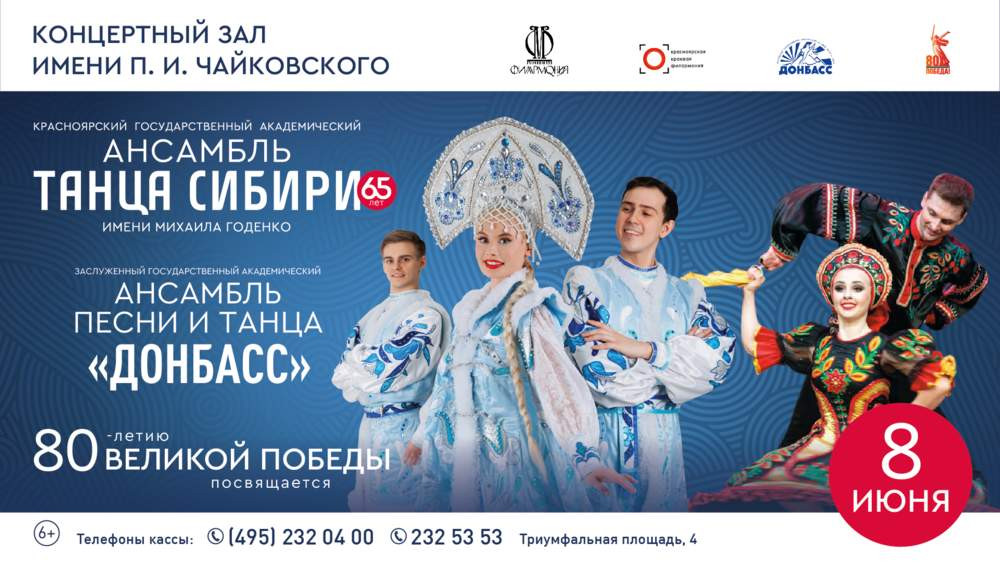8 июня на сцене главной концертной площадки Московской филармонии - Концертного зала имени П. И. Чайковского - выступят артисты Красноярского государственного академического ансамбля танца Сибири имени Михаила Годенко и заслуженного государственного академического ансамбля песни и танца «Донбасс».