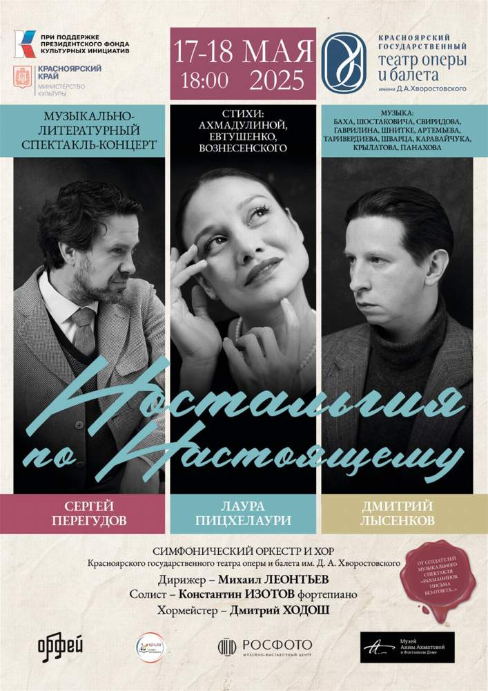 В мае на сцене Красноярского театра оперы и балета имени Д. А. Хворостовского известные актёры театра и кино Дмитрий Лысенков, Сергей Перегудов и Лаура Пицхелаури прочитают стихи поэтов-шестидесятников в сопровождении любимой музыки из кинофильмов.