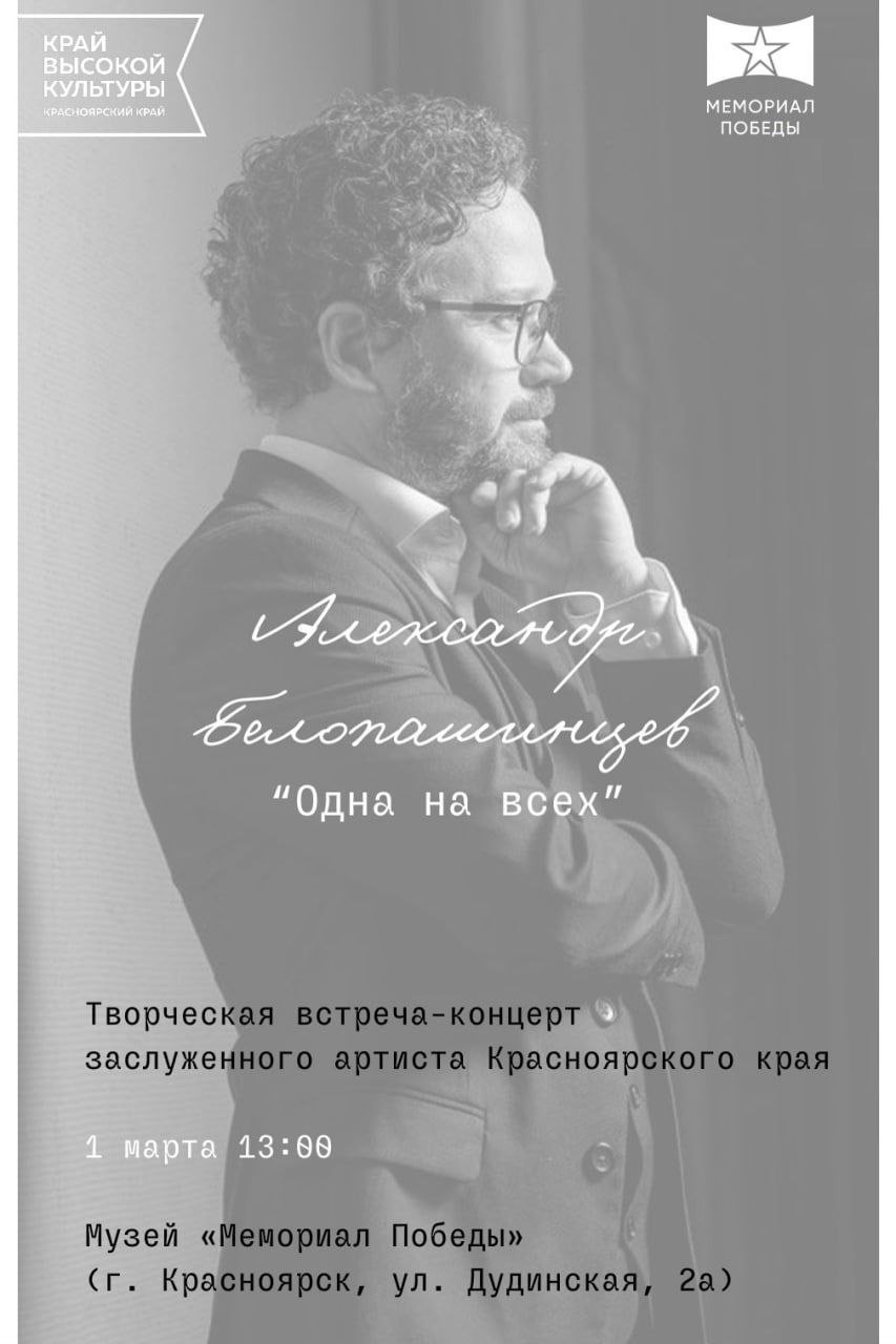 Зрителей ожидает концерт, посвящённый Году единства народов России, с участием Красноярского духового оркестра. Также в этот вечер состоится творческая встреча-концерт «Одна на всех» с Александром Белопашинцевым.