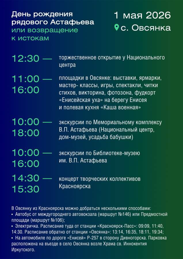 13.30, 16.30 — экскурсии по мемориальному комплексу В. П. Астафьева (дом-музей, усадьба бабушки Е. П. Потылицыной, выставочный зал).