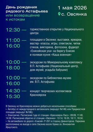 1 мая с 11 до 16 часов на родине Виктора Петровича Астафьева в Овсянке пройдёт ежегодный семейный праздник, посвящённый дню рождения великого российского писателя.