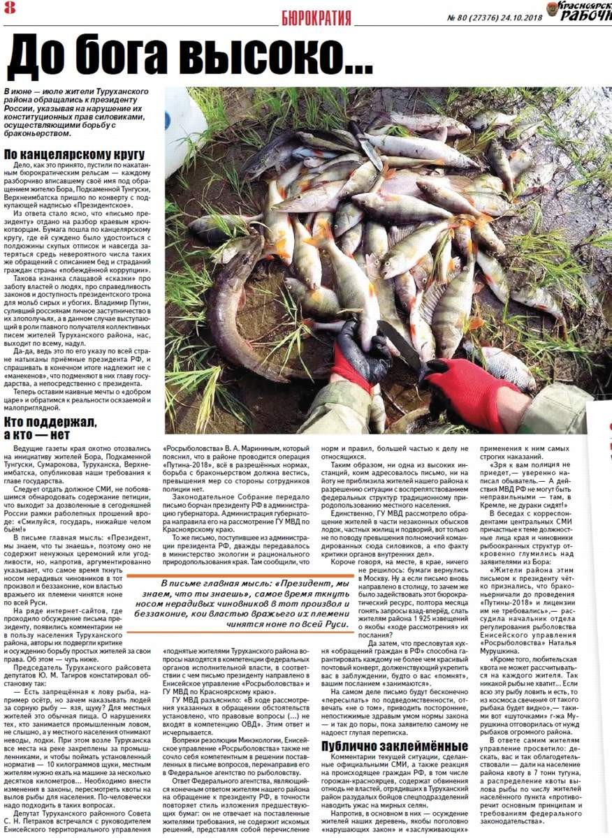 Летом жители Туруханского района обращались к президенту России, указывая на нарушение их конституционных прав силовиками, осуществляющими борьбу с браконьерством. Дело, как это принято, пустили по накатанным бюрократическим рельсам. Бумага пошла по канцелярскому кругу, где ей суждено было удостоится с полдюжины скупых отписок...
