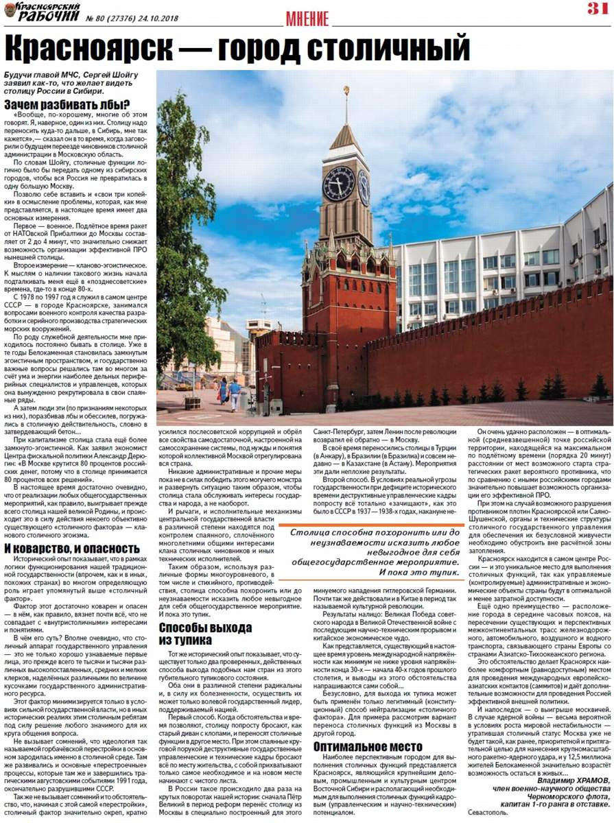 Будучи главой МЧС, Сергей Шойгу заявил как-то, что желает видеть столицу России в Сибири. Член военно-научного общества Черноморского флота, капитан 1-го ранга в отставке Владимир Храмов, приславший в "КР" письмо из Севастополя, с ним согласен. Более того, он считает, что переносить столицу нужно в Красноярск.