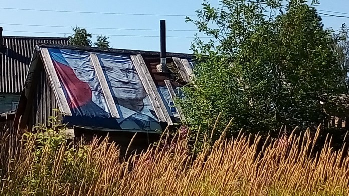 Банька с приколоченным косо-криво портретом нынешнего главы Карелии принадлежит пенсионерам, у которых нет средств на дорогое кровельное железо. А растяжка способна надежно охранять помещение от сырости в течение нескольких сезонов. Старикам единороссы железа не предложили, взамен крепкого баннера привезли рубероид и дали бесплатно рабочих.