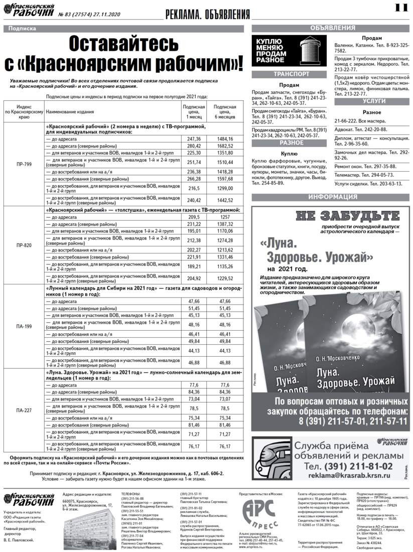 Продолжается подписка на первое полугодие 2021 года на "Красноярский рабочий"и его дочерние издания-ежегодники: газету "Лунный календарь для Сибири" и журнал "Луна. Здоровье. Урожай".