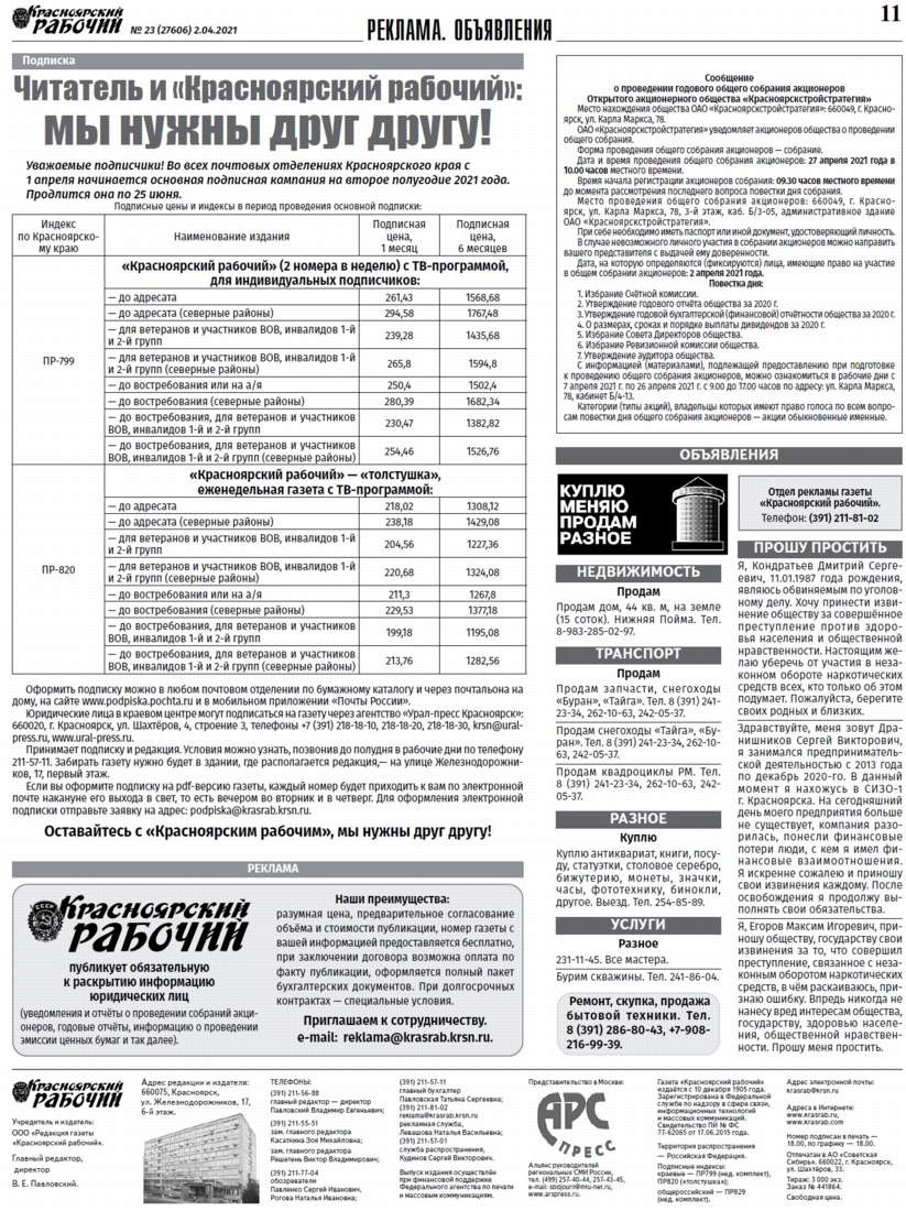 Подписаться на "Красноярский рабочий" на первое полугодие 2021 года можно с получением газеты с мая.