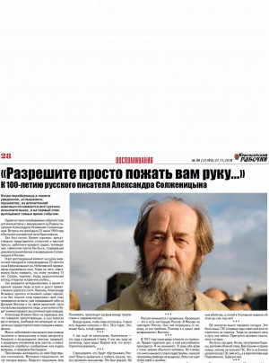 Читательница "КР" Лариса Голубь из села Ермаковского напомнила, что в этом году отмечается 100-летие со дня рождения русского писателя Александра Солженицына. И рассказала о встрече с ним, вернувшимся на Родину, 23 июня 1994 года в Большом концертном зале Красноярска. Большинство мыслей классика не потеряли своей актуальности.