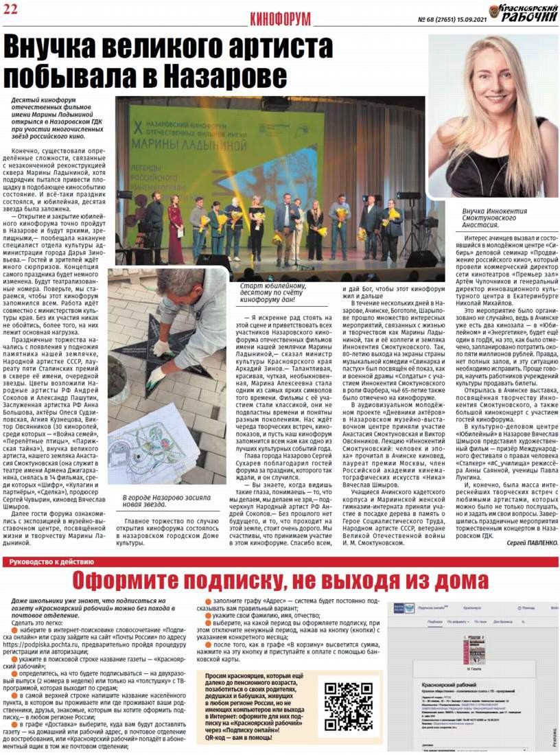 Десятый кинофорум отечественных фильмов имени Марины Ладыниной открылся в Назаровском ГДК при участии многочисленных звёзд российского кино. Праздничные торжества начались с появления у подножия памятника нашей землячке, народной артистке СССР, лауреату пяти Сталинских премий в сквере её имени, очередной звезды. Цветы возложили народные артисты РФ Андрей Соколов и Александр Пашутин, заслуженная артистка РФ Анна Большова, актёры Олеся Судзиловская, Агния Кузнецова, Виктор Овсянников (30 киноролей, среди которых - "Война семей", "Перелётные птицы", "Парижская тайна"), внучка великого артиста, нашего земляка Анастасия Смоктуновская (она служит в театре имени Армена Джигарханяна, снялась в 14 фильмах, среди которых "Шифр", "Кулагин и партнёры", "Сделака"), продюсер Сергей Чувырин, киновед Вячеслав Шмыров.