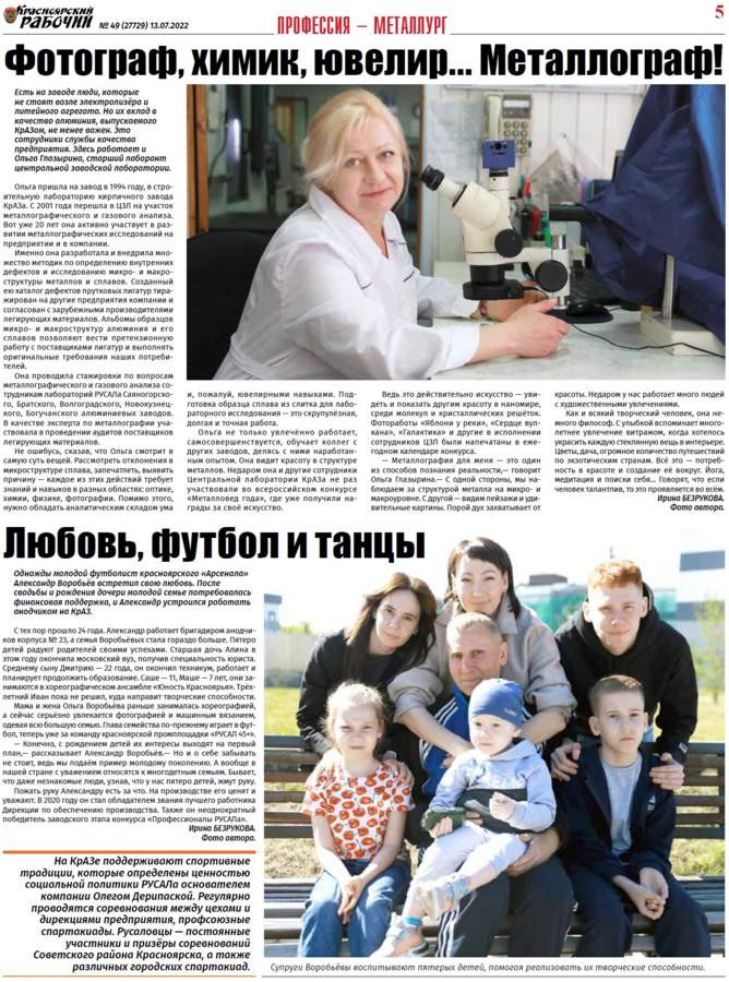 Есть на заводе люди, которые не стоят возле электролизёра и литейного агрегата. Но их вклад в качество алюминия, выпускаемого КрАЗом, не менее важен. Это сотрудники службы качества предприятия. Здесь работает и Ольга Глазырина, старший лаборант центральной заводской лаборатории. Ольга пришла на завод в 1994 году, в строительную лабораторию кирпичного завода КрАЗа. С 2001 года перешла в ЦЗЛ на участок металлографического и газового анализа. Вот уже 20 лет она активно участвует в развитии металлографических исследований на предприятии и в компании. Именно она разработала и внедрила множество методик по определению внутренних дефектов и исследованию микро- и макроструктуры металлов и сплавов. Созданный ею каталог дефектов прутковых лигатур тиражирован на другие предприятия компании и согласован с зарубежными производителями легирующих материалов. Альбомы образцов микро- и макроструктур алюминия и его сплавов позволяют вести претензионную работу с поставщиками лигатур и выполнять оригинальные требования наших потребителей.