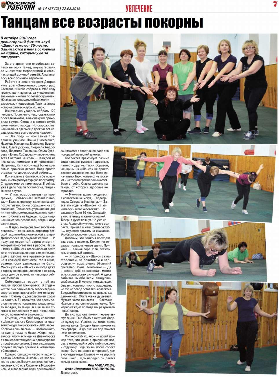 В октябре 2018 года дивногорский фитнес-клуб "Шанс" отметил 35-летие. Занимаются в нём в основном женщины, которым уже за пятьдесят. За это время они стали настоящей дружной семьёй. А начиналось всё с обычной аэробики. Хореограф Светлана Ишкова собрала в 1983 году группу, где и взялись за упражнения, знакомые многим по телепрограммам...