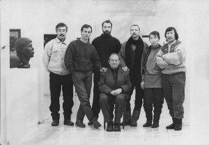 Были мы с ним и у выпускников творческих мастерских Российской академии художеств, где мастерскую живописи возглавлял академик Анатолий Павлович Левитин из Санкт- Петербурга, замечательный человек и большой мастер. И эта его фотография, сделанная в художественном музее имени В. И. Сурикова накануне открытия там выставки работ этих художников, поймала момент единения уникальных творцов со своим учителем.