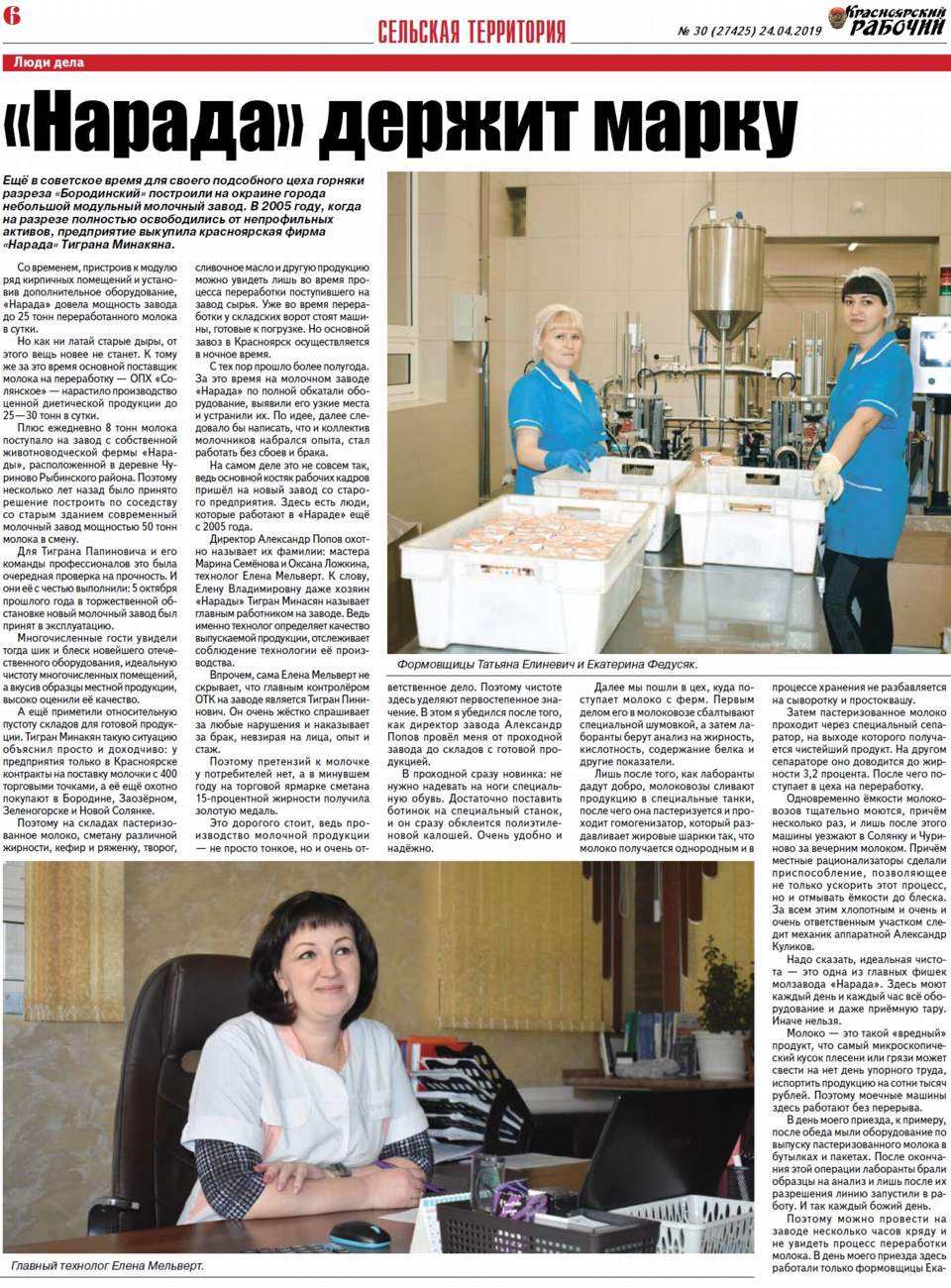 В советское время для своего подсобного цеха горняки разреза "Бородинский" построили небольшой модульный молочный завод. В 2005 году предприятие выкупила красноярская фирма "Нарада" Тиграна Минакяна. Через несколько лет объём производства молочной продукции заметно превысит здесь плановые 50 тонн. Как удалось добиться такого успеха, разбирался журналист "КР" Виктор Решетень.