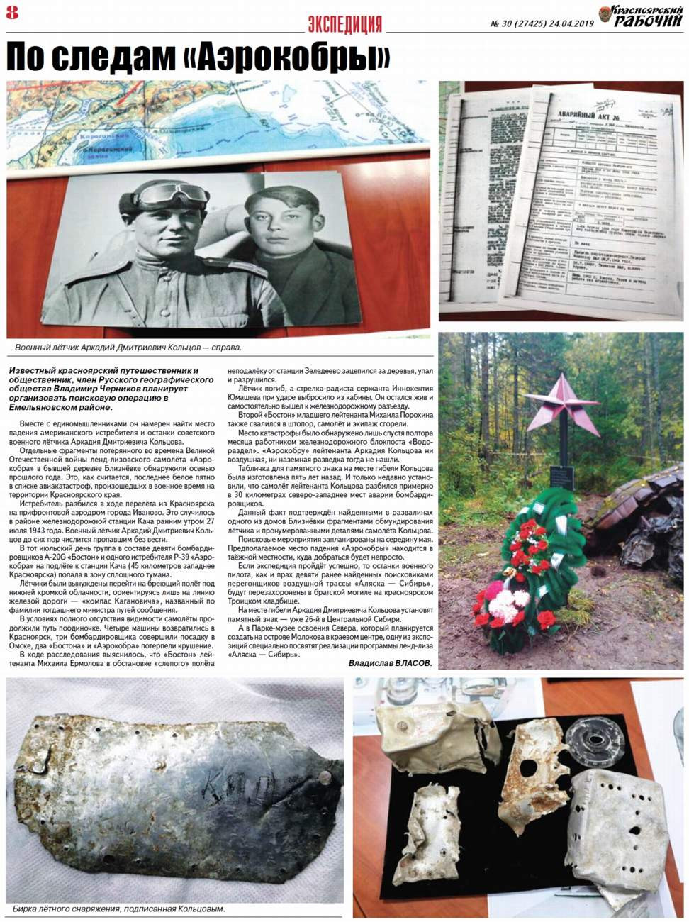 Известный красноярский путешественник, член Русского географического общества Владимир Черников планирует организовать поисковую операцию в Емельяновском районе. Вместе с единомышленниками он намерен найти место падения американского истребителя и останки советского военного лётчика Аркадия Кольцова. Отдельные фрагменты потерянного во времена войны ленд-лизовского самолёта "Аэрокобра" обнаружили осенью прошлого года.