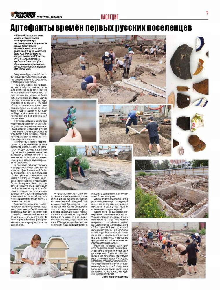 Учёные СФУ презентовали находки, сделанные на месте раскопок при реконструкции исторических зданий Красноярска - "Дома Кусковых" второй половины XIX века и "Жилого дома Н. А. Фон-Эзерского второй половины XIX века". Фундаменты построек, предметы быта, посуды и убранства домов, остатки печей, погребов датируются XVII-XIX веками. Генеральный директор АО "Исторический квартал" Алексей Аккуратов раскрыл планы по сохранению и реставрации объектов: "Сначала здесь, на площадке, мы разобрали здания, потом шла сортировка брёвен, оценка их технического состояния, насколько они пострадали за более чем 150-летнюю историю. Сейчас работы перешли на следующую стадию: специалисты спасают объекты археологического наследия. Потом мы снова соберём здесь срубы и вернём улице Карла Маркса её привычный облик, произойдёт это в конце осени или начале зимы".