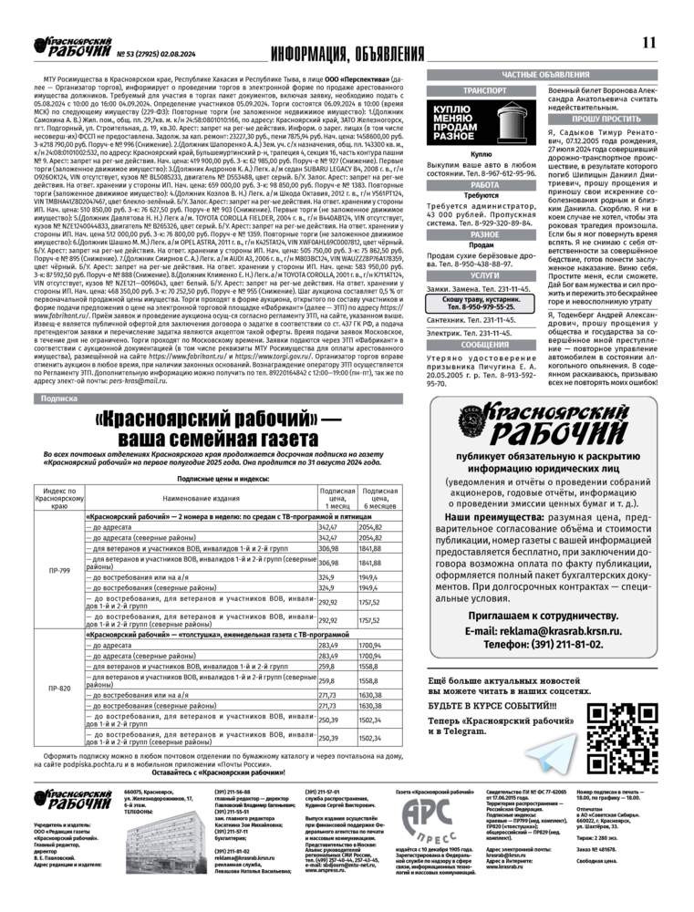 Во всех почтовых отделениях продолжается досрочная подписка на газету "Красноярский рабочий" на первое полугодие 2025 года.
