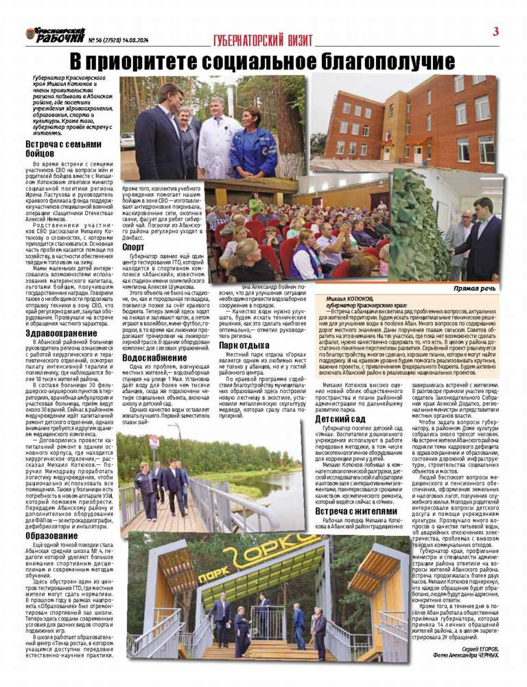 Губернатор Красноярского края Михаил Котюков и члены правительства региона побывали в Абанском районе, где посетили учреждения здравоохранения, образования, спорта и культуры. Кроме того, губернатор провёл встречу с жителями. Во время встречи с семьями участников СВО их родственники участников СВО рассказали Михаилу Котюкову о сложностях, с которыми приходится сталкиваться. Основная часть проблем касается помощи по хозяйству, в частности обеспечения твёрдым топливом на зиму. Мамы маленьких детей интересовались возможностями использования материнского капитала, льготами бойцам, получившим государственные награды. Говорили также о необходимости продолжать отправку техники в зону СВО, что край регулярно делает, закупая оборудование. Прозвучали на встрече и обращения частного характера...