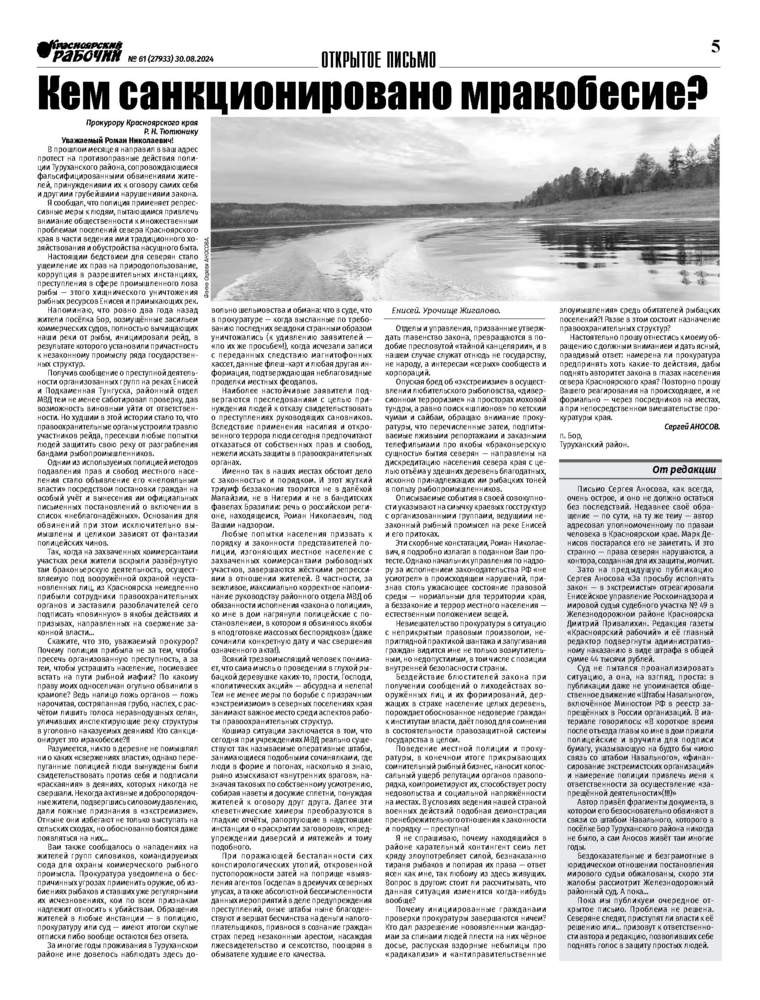 Житель посёлка Бор Туруханского района сергей Аносов решил через газету обратиться к прокурору Красноярского края Роману Тютюнику. "В прошлом месяце я направил в ваш адрес протест на противоправные действия полиции Туруханского района, сопровождающиеся фальсифицированными обвинениями жителей, принуждениями их к оговору самих себя и другими грубейшими нарушениями закона, - пишет он. - Я сообщал, что полиция применяет репрессивные меры к людям, пытающимся привлечь внимание общественности к множественным проблемам поселений севера Красноярского края в части ведения ими традиционного хозяйствования и обустройства насущного быта. Настоящим бедствием для северян стало ущемление их прав на природопользование, коррупция в разрешительных инстанциях, преступления в сфере промышленного лова рыбы - этого хищнического уничтожения рыбных ресурсов Енисея и примыкающих рек".