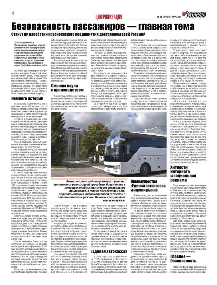 25 - 26 сентября в Красноярске пройдёт научно-практическая конференция с очень необычным названием: "Перспективы применения цифровых технологий для обеспечения безопасности и качества услуг по перевозке пассажиров. Практический опыт ОАО "Автоколонна 1967". Главным организатором конференции выступил Российский автотранспортный союз, генеральным партнёром - ОАО "Автоколонна 1967" (Красноярск), а партнёрами - саморегулируемая организация "Союз транспортников Сибири" (Новосибирск), ассоциация "Союз транспортников Хабаровского края" и ЗАО "Автоэкспресс" (автовокзал Красноярска). Подробности - в материале журналиста Владимира Пантелеева.